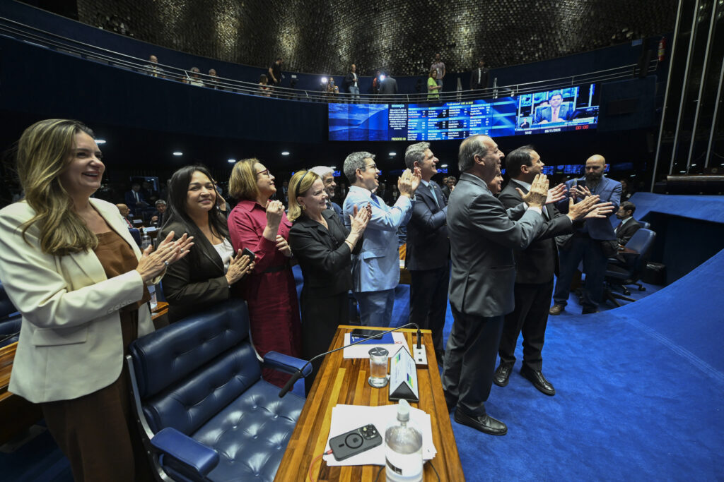 Senadores(as) comemoram a aprovação do projeto que isenta trabalhadores que ganham até R$5mil por mês (foto: Carlos Moura/Agência Senado)